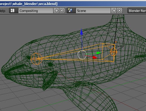 Importando los OBJ a Blender me he encontrado con partes de malla que despues, para el juego he necesitado que estuvieran unidos. En casi todos los programas de 3D a esta funcion se le llama Merge pero en Blender solo he encontrado el CTRL+ J para unir diferentes mallas y hacer de ellas una sola. En nuestro caso, la ballena se puede subdividir en cabeza,aletas,cola y dos partes del cuerpo; para crear entonces el logickBricks era necesario unir todas estas partes en una sola malla llamada orca. Con el shift voy seleccionando cada una de ellas y finalmente le doy a las teclas CTRL y J.